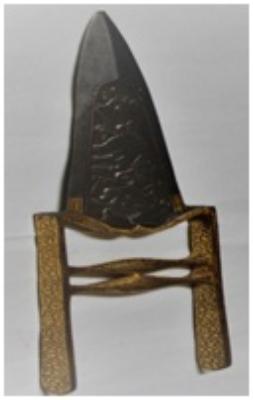 | Description / विवरण | Double barrel handle inlaid with gold. Blade with hunt scene on one side and elephant fight on the other on bas relief. |