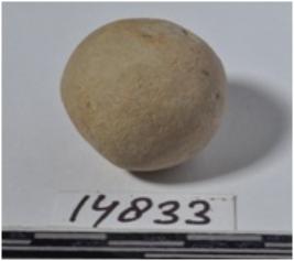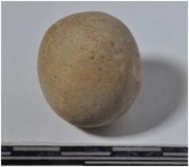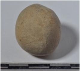 | Description / विवरण | A terracotta sling ball round in shape of rough surface. |
