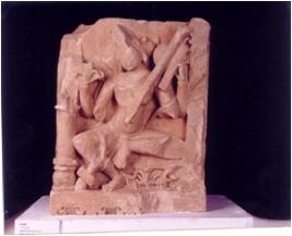 | Description / विवरण | Four armed Saraswati, seated in lalitasana on a padmapitha within the pilastered niche. She holds an akshamala and a book in her upper right and left hands respectively while both the lower hands are broken. Vina is seen across the body, which is broken in the middle. Her head right breast and the left leg are broken. She is wearing usual armaments. |