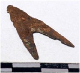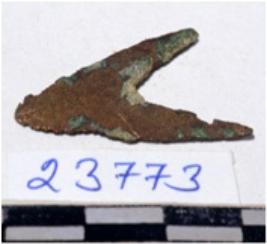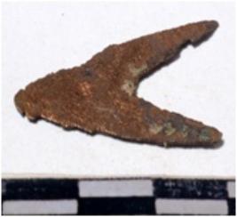 | Description / विवरण | A fragment of a copper arrow head triangular in shape pointed on one end of rough surface. |