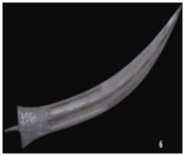 | Description / विवरण | This is a Double-Edged dagger made of steel, partly edged with very fine damascening marks and without its hilt. The dagger is marked with inscriptions, of birds andfloral decorations in bas relief on either side. There is a legend inscribed on one side of the dagger which reads Guetan Jahmasp Safur and on the other Muzaffar al Kashan. |