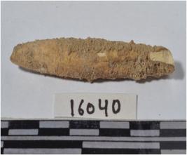 | Description / विवरण | A fragment of a bone point, pointed at one side, circular in section and rough surface. |