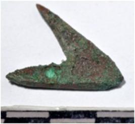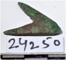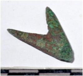 | Description / विवरण | A copper arrow head triangular in shape pointed at one end of rough surface. |