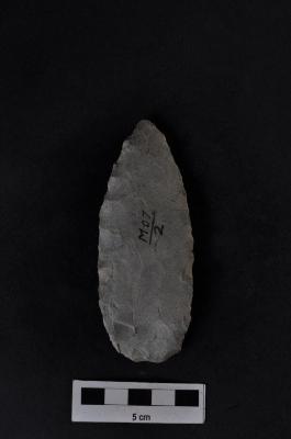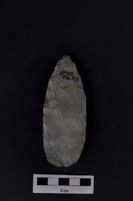 | Description / विवरण | Leaf shaped point, flake scars on both surface, retouched along the periphery. |