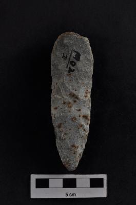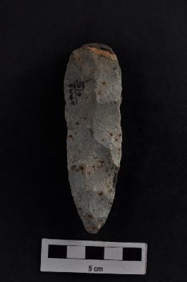 | Description / विवरण | Leaf shaped point, flake scars on both surface, retouched along the periphery, diffused bulb with striking platforem. |