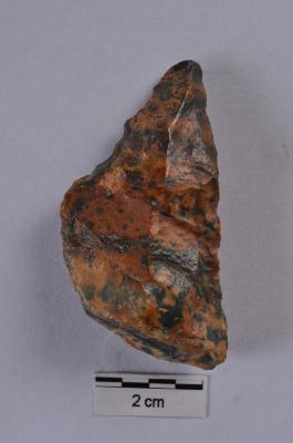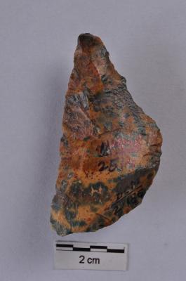 | Description / विवरण | Scraper with double edge, one convex and another straight working edge, semicircular in shape, retouches on working edges. |