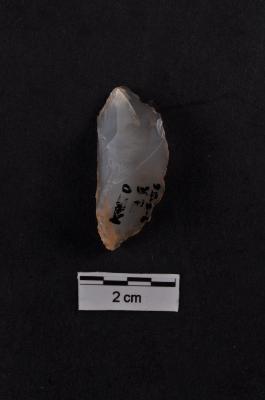 | Description / विवरण | Scraper, semicircular in shape, convex working edge with retouches, diffused bulb with striking platform at proximal end. |