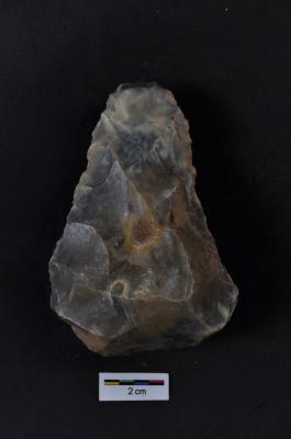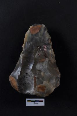 | Description / विवरण | Levalloisian Handaxe, triangular in shape, broad butt end, nicely flaked surface, cortex visible on butt end. |