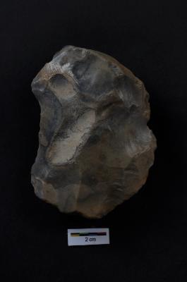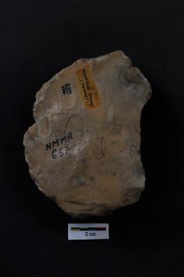 | Description / विवरण | Side scraper, end struck, diffused bulb visible, striking platform absent, retouches on convex working edge. |