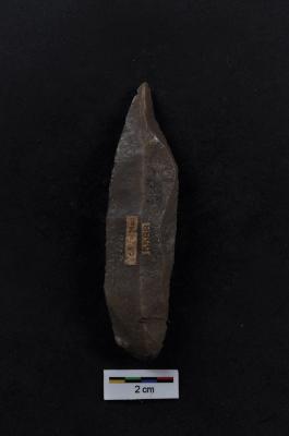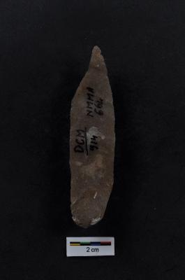 | Description / विवरण | Pressure flaked leaf point, long body, prominent bulb with prepare striking platform at proximal end, pointed distal end, a ridge on dorsal surface. |