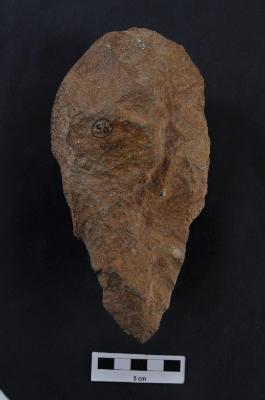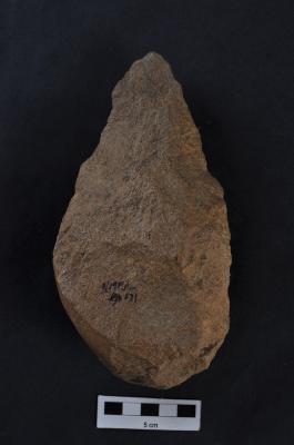 | Description / विवरण | Handaxe, made on pebble, cortex visible on butt end, round butt end, long pointed end. |