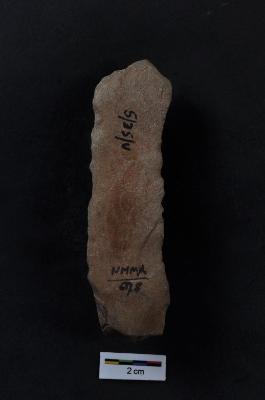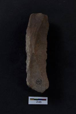 | Description / विवरण | Blade, long body, prominent bulb with striking platform at proximal end, two ridges on dorsal surface, use-ware marks on both working edges. |