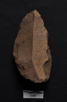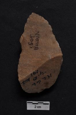 | Description / विवरण | Scraper, pointed distal end, a ridge on dorsal surface, use-ware marks on along the periphery |