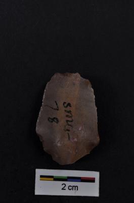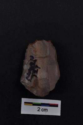 | Description / विवरण | Scraper, oval shape, convex working edge with retouches on it, two uneven ridges on dorsal surface. |