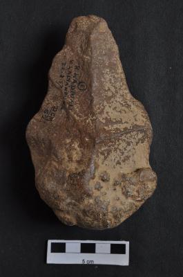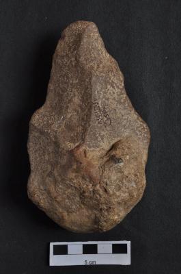 | Description / विवरण | Handaxe, made on pebble, pear shaped, pointed working end, round butt end with cortex. |