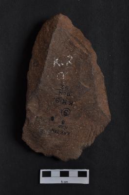 | Description / विवरण | Cleaver with unusual working edge, pointed cutting edge, made on flake. |