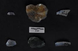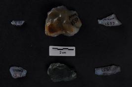 | Description / विवरण | 5 Chalcedony objects one flake and 4 blades 1 chert flake |