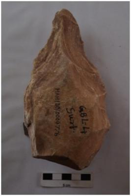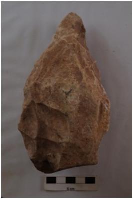 | Description / विवरण | Handaxe, bifacial, pointed distal end. |