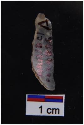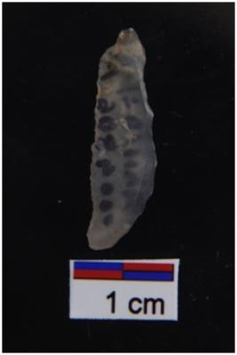 | Description / विवरण | Backed blade, retouches on working edge, backing on another edge. |