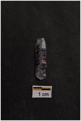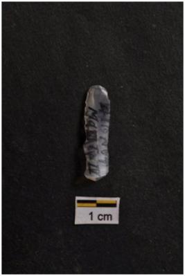 | Description / विवरण | Blade, parallel sided, prominent bulb with striking platform at proximal end, use-ware marks on both working edges. |