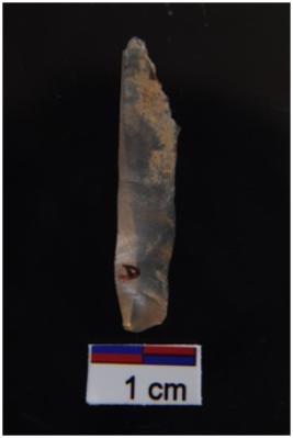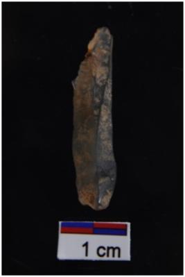 | Description / विवरण | Blade, parallel sided, prominent bulb with striking platform at proximal end, a ridge on dorsal surface, use wear marks on both edges. |