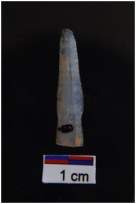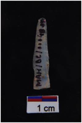 | Description / विवरण | Blade, with tapering sides, diffused bulb with striking platform at proximal end, two ridges on dorsal surface use wear marks on both edges. |