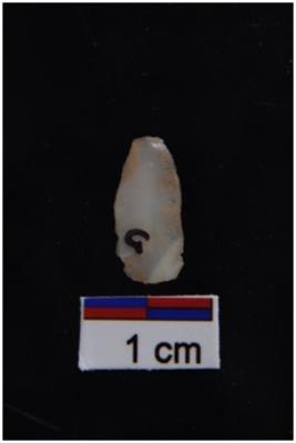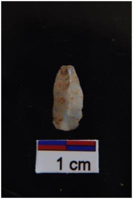 | Description / विवरण | Blade, small size, with one convex and another concave working edges, diffused bulb with striking platform at proximal end, a ridge on dorsal surface, use wear marks on both edges. |