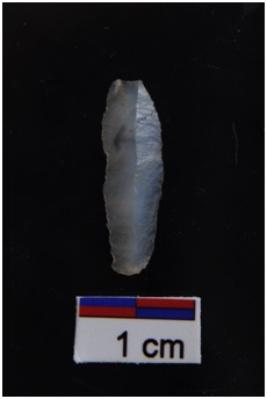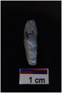| Description / विवरण | Blade, with convex sides, diffused bulb with striking platform at proximal end, a ridge on dorsal surface, use wear marks on both edges. |