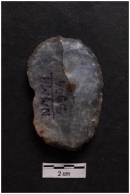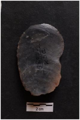| Description / विवरण | Scraper, oval shape, a ridge on dorsal surface, use-ware marks working edge. |