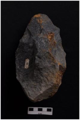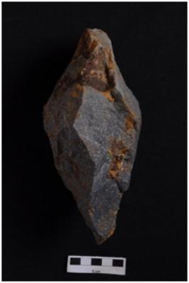 | Description / विवरण | Handaxe, bifacial, semicircular butt end, retouches along the periphery. |