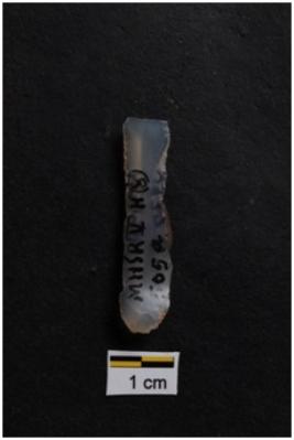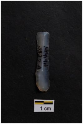 | Description / विवरण | Blade, prominent bulb with striking platform at proximal end, a ridge on dorsal surface, use-ware marks on both working edges. |