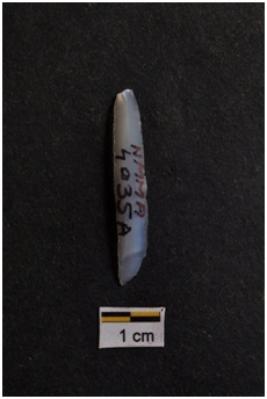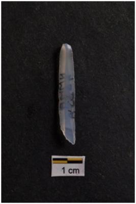 | Description / विवरण | Blade, parallel sided, prominent bulb with striking platform at proximal end, a ridge on dorsal surface, use-ware marks on both working edges. |