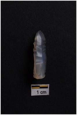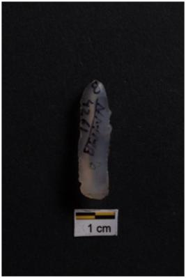 | Description / विवरण | Blade, parallel sided, prominent bulb with striking platform at proximal end, a ridge on dorsal surface, use-ware marks on both working edges. |