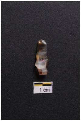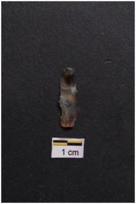 | Description / विवरण | Blade, with irregular sides, prominent bulb with striking platform at proximal end, a ridge on dorsal surface, ripple marks on ventral surface, |