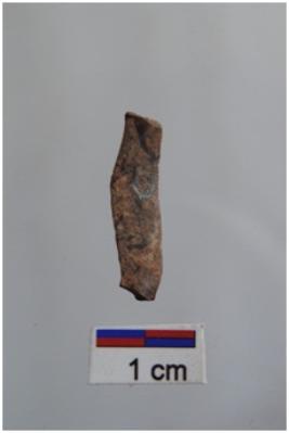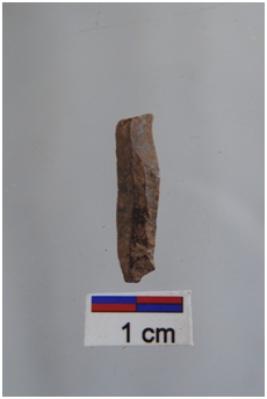 | Description / विवरण | Blade, diffused bulb with striking platform at proximal end, two ridges on dorsal surface, use-ware marks on both working edges. |