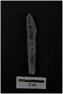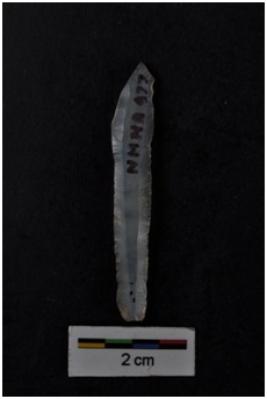 | Description / विवरण | Blade, parallel sided, two ridges on dorsal surface, use-ware marks on working edges. |