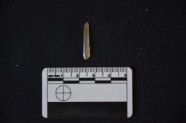| Description / विवरण | Chalcedony blade fragment has crested guided ridge on dorsal side, striking platform, bulb on ventral side, broken from distal end, use-wear marks on cutting edges and raw-material given heat treatment. |