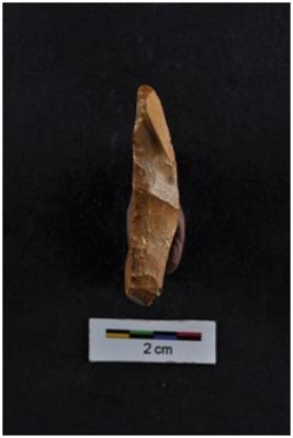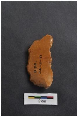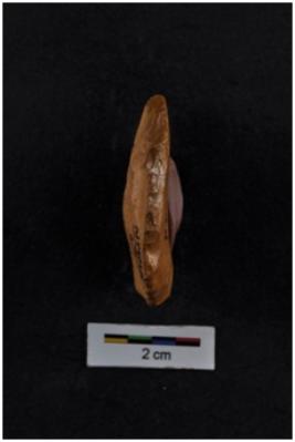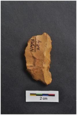 | Description / विवरण | Scraper, semicircular in shape, striking platform visible at one end, retouches on working edge. |