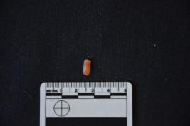 | Description / विवरण | Chalcedony blade fragment heated has two ridges on dorsal side, striking platform, bulb on ventral side, broken from distal end, trapezoidal cross-section and use-wear marks on cutting edges. |