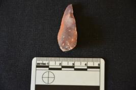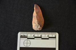 | Description / विवरण | A chert notched blade with bulb and notched at the distal end. The edges are with use mark. |