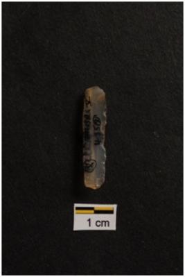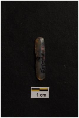 | Description / विवरण | Blade, parallel sided, prominent bulb with striking platform at proximal end, a ridge on dorsal surface, use-ware marks on both working edges. |