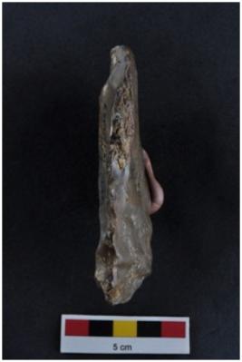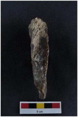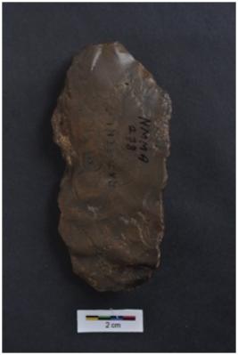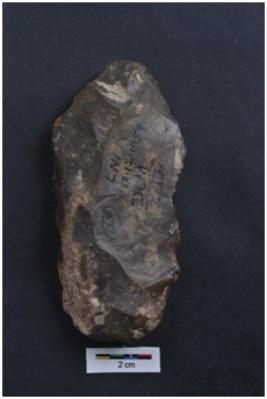 | Description / विवरण | Scraper on a large sub-triangular flake of levallois type, prominent bulb with striking platform, retouches on working edge. |