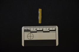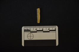 | Description / विवरण | Chalcedony blade fragment has two ridges on dorsal side, striking platform bulb on ventral side, broken from distal end, retouches on cutting edges and trapezoidal cross-section. |