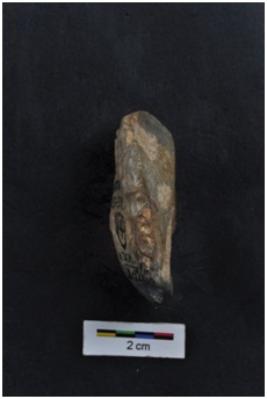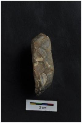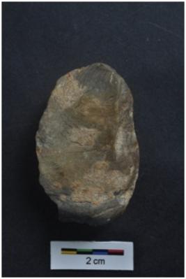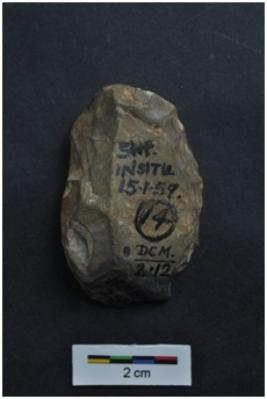 | Description / विवरण | Side scraper, end struck, striking platform with bulb, a ridge on dorsal surface, retouches on working edge. |