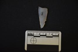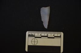 | Description / विवरण | Chalcedony point has two ridges on dorsal side, broken from proximal end, pointed at distal end, retouches on both the edges and trapezoidal cross-section. |