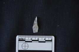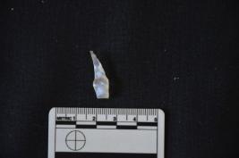 | Description / विवरण | Chalcedony blade fragment has crested guided ridge on dorsal side, broken from proximal end, pointed along at distal end, triangular cross-section and use-wear marks on cutting edges. |