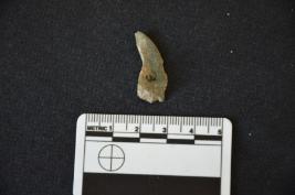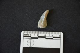 | Description / विवरण | Chert utilized flake has midridge on dorsal side, striking platform, diffused bulb on ventral side and use wear marks on working edge. |
