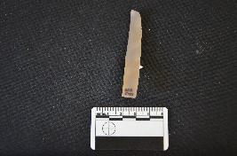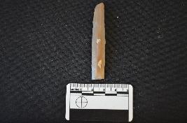 | Description / विवरण | Fragment of chert parallel sided chert blade has two ridges on dorsal side, striking platform, diffused bulb on ventral side, broken from proximal end, use-wear marks on cutting edges and trapezoidal cross-section. |