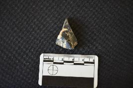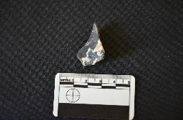 | Description / विवरण | A chert utilized flake has flake scars on dorsal side, striking platform, negative bulb on ventral side and use wear marks on working edge. |