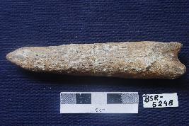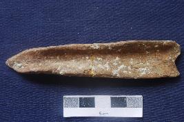 | Description / विवरण | A bone split which has be modified, one end is pointed and the other is wider. It is slightly encrusted. One side is grooved. |
